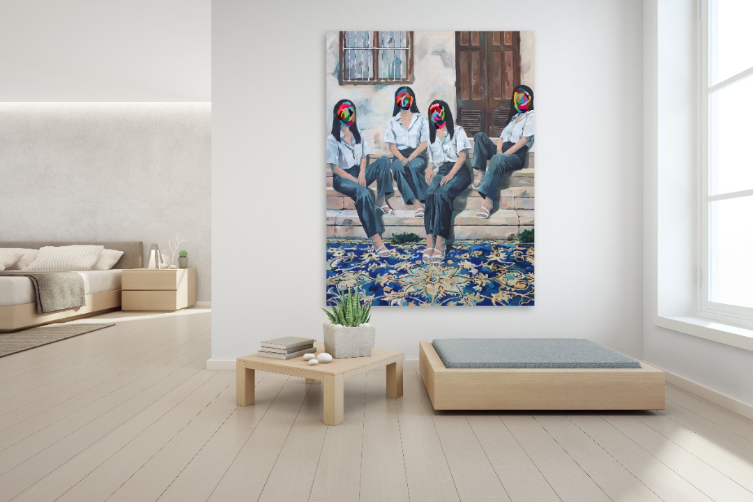 A native of Indonesia, Iqi Qoror started his career as a professional Visual Artist with a Master’s Degree in Fine Art. Qoror's combination of different media merges not only different art practices such as painting and embroidery but past and present as well. The combination of modern expressionistic style of portraits without faces with pops of color render his artworks unforgettably visceral.