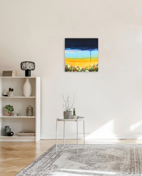 This 25-inches square original pop landscape painting on canvas is signed by the artist on the front and back. This artwork is framed in a simple white frame and is wired and ready to hang. Size and price include the frame. Free local Los Angeles delivery. Affordable Continental U.S. and International shipping. A Certificate of Authenticity issued by the gallery is included.