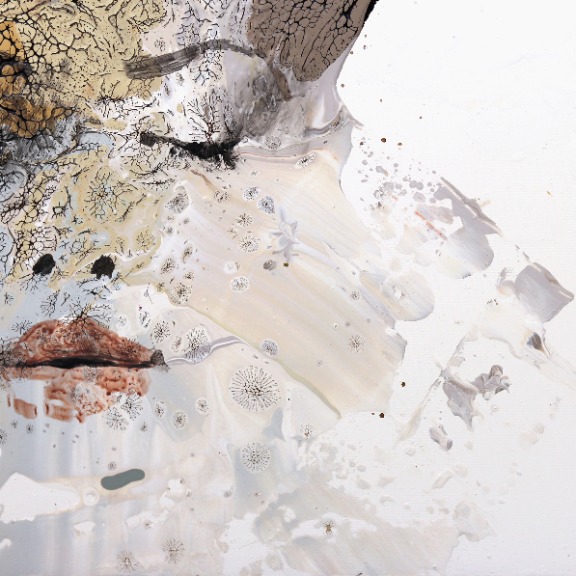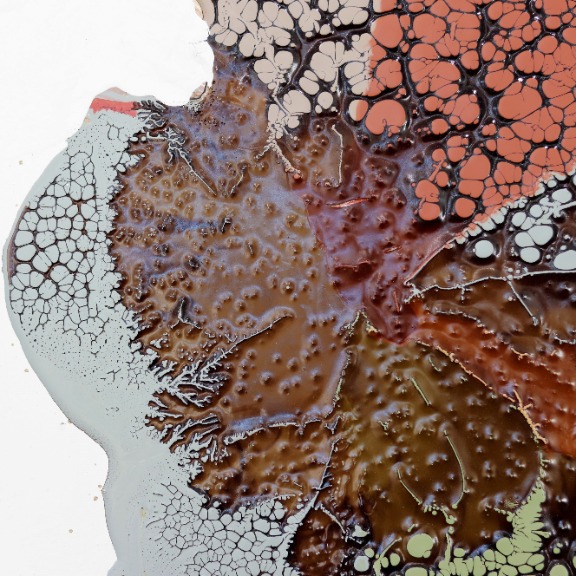 This 32-inch high by 24-inch wide original artwork is painted with industrial paint, water, and white spirit enamel on canvas. The colors develop into organic shapes with a textured crackle effect. The work becomes material, alive.