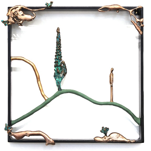 This unique bronze and painted steel sculpture measures 12 inches square and 2 inches deep. It is signed by Stratman on the front and back. Free local Los Angeles delivery. Affordable Continental U.S. and International shipping available. A certificate of authenticity issued by the art gallery is included.