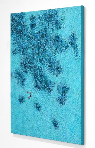 The textural aerial ocean and beach scene paintings of Elizabeth Langreiter are a delightful escape from reality into a playful and joyful world. Her mixed-media art often evokes the viewer to experience happy flashbacks to a favorite time or place through a sophisticated combination of pattern, color, and three-dimensional textured umbrellas, towels, waves, or snow along with people enjoying the water or skiers enjoying the slopes.